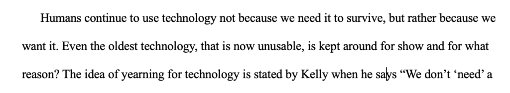 Between my rough draft of 800 words and final draft of 1500 words, I had performed many revisions. The rough draft consisted of an introduction, a body paragraph, and a very brief opening to my second body paragraph. When I gave my very rough draft to my peers to revise, they performed both global and local revisions. With their aid, I was able to remove quotes that were not useful to my argument, and I was able to add new quotes that provided solid evidence and introduce new ideas. In screenshot 3, there is an example of a quote that was originally used in my first draft. Compared to my final draft, this quote no longer exists because it did not focus on my thesis and was very weak. My global revisions consisted of reworking my thesis, moving around topic sentences, and digging into my quotes for deeper analysis. I was able to focus heavily on global revisions when I began revising to add more depth to my paper, which allowed me to focus on local revisions later. For example, screenshot 1 was taken from my 800-word draft that introduced an idea that was not related to my thesis. However, screenshot 2 shows a new topic sentence that flows into a paragraph with complex ideas that actually applies to my thesis. These screenshots provide specific changes that I made when engaging in global revisions. I used to be unable to understand how to revise my own work, but taking an outside perspective to revise my own work granted me the ability to engage in global revisions. I truly resonated with this project more than my previous essays because I felt as though I could add my own perspective to engage the audience in a complicated topic. Once I got my draft to around 1500 words, I made local revisions by spending my time proofreading each sentence to add clarity and remove run-on sentences. This included checking my grammar, ensuring my paper was in MLA format, and simply reading my work aloud. The revisions that both me and my peers made between 800 and 1500 words allowed me to develop an essay with a natural flow and give purpose to a significant topic. Reviewing and revising my own essay has allowed me to engage in deeper thinking and dive deeper into the texts on hand through global revisions. Overall, my writing and ability to peer review developed throughout this project and by revising my own writing, I can now critique both my own and others work.